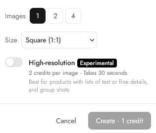 For products with text, fine details, or when you need pixel-perfect quality, enable High-resolution mode. This uses a more powerful model that produces sharper, more detailed results. High-resolution images cost 2 credits each (instead of 1) and take about 30 seconds to generate.