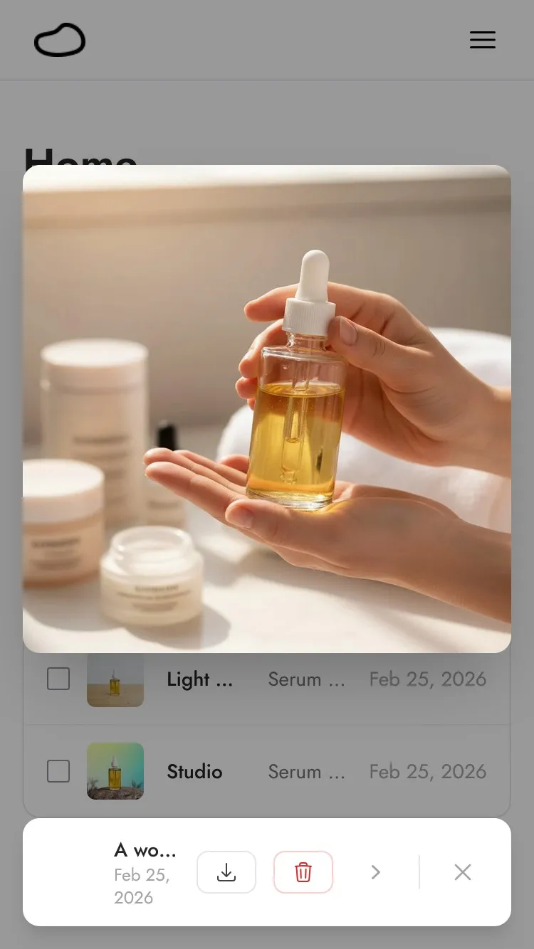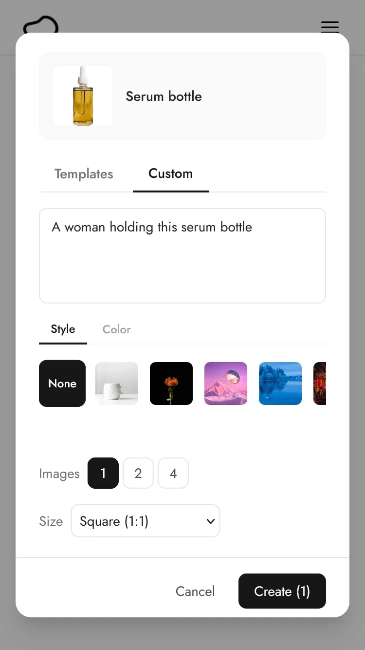 If you want something more specific, click on Custom to describe the background you want in your own words. For example, "A woman holding this serum bottle", "On a marble countertop with soft morning light", or "In a cozy kitchen with wooden shelves". You have complete creative freedom to describe any scene you can imagine.